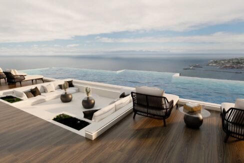 The oceanfront pool villa with a Jacuzzi pond and modern design is a luxurious three-story retreat with spacious living areas…